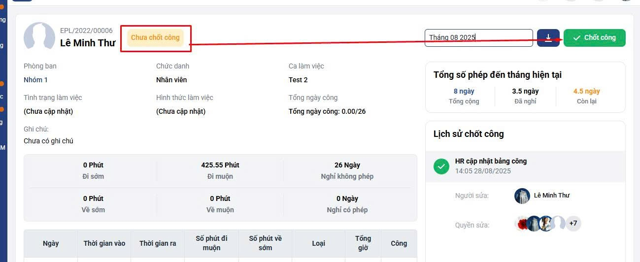 + Khi HR sửa bảng công, hệ thống hiển thị lại nút chốt công bên bảng công cá nhân của nhân sự