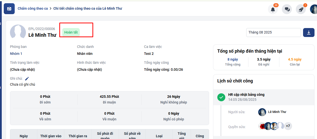Sau khi HR chốt công, trạng thái được trả về Hoàn tất
