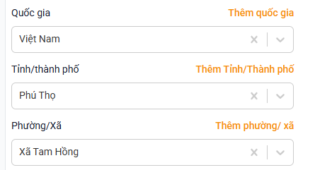 - Với khách hàng có Quốc gia là Việt Nam: thông tin địa chỉ sẽ hiển thị Thành phố và Phường xã, trường Quận/Huyện bị ẩn. Những quốc gia khác có 3 cấp thì sẽ hiển thị lên trường Quận/Huyện.