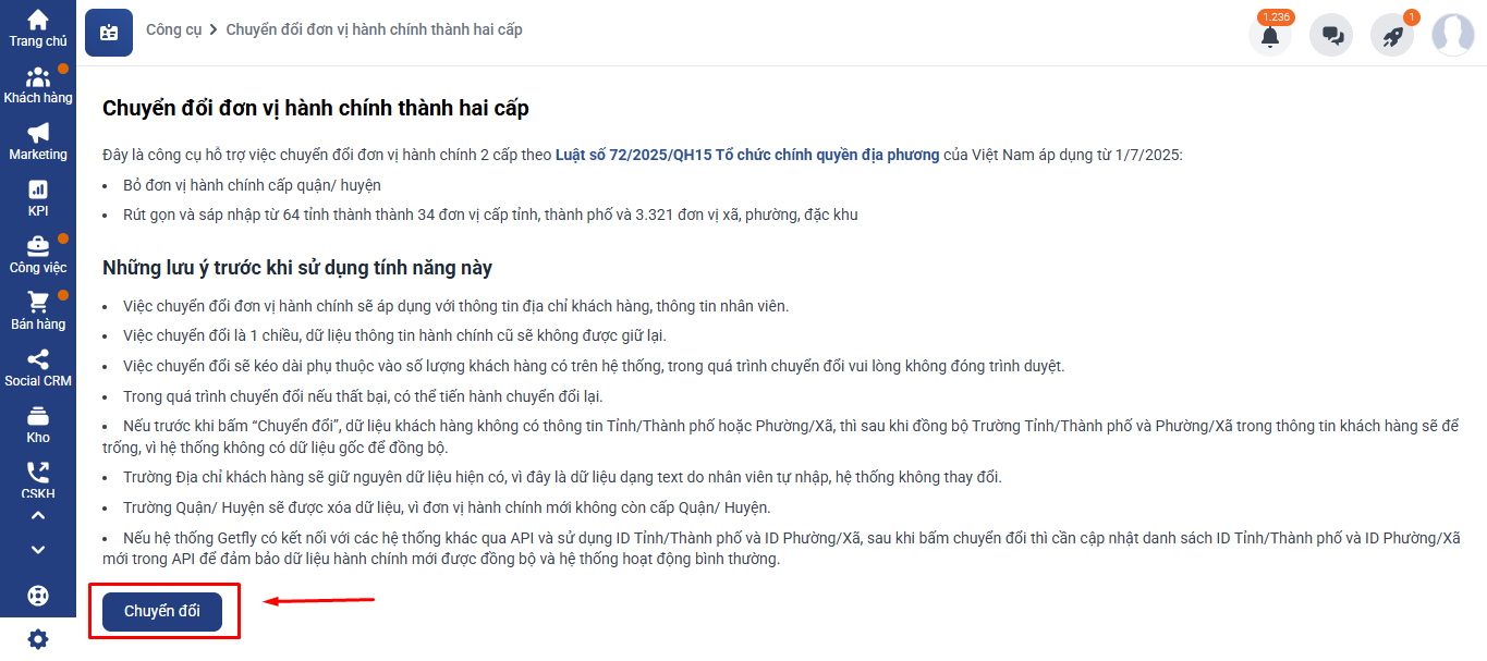 - Nếu hệ thống Getfly có kết nối với các hệ thống khác qua API và sử dụng ID Tỉnh/Thành phố và ID Phường/Xã, sau khi bấm chuyển đổi thì cần cập nhật danh sách ID Tỉnh/Thành phố và ID Phường/Xã mới trong API để đảm bảo dữ liệu hành chính mới được đồng bộ và hệ thống hoạt động bình thường.