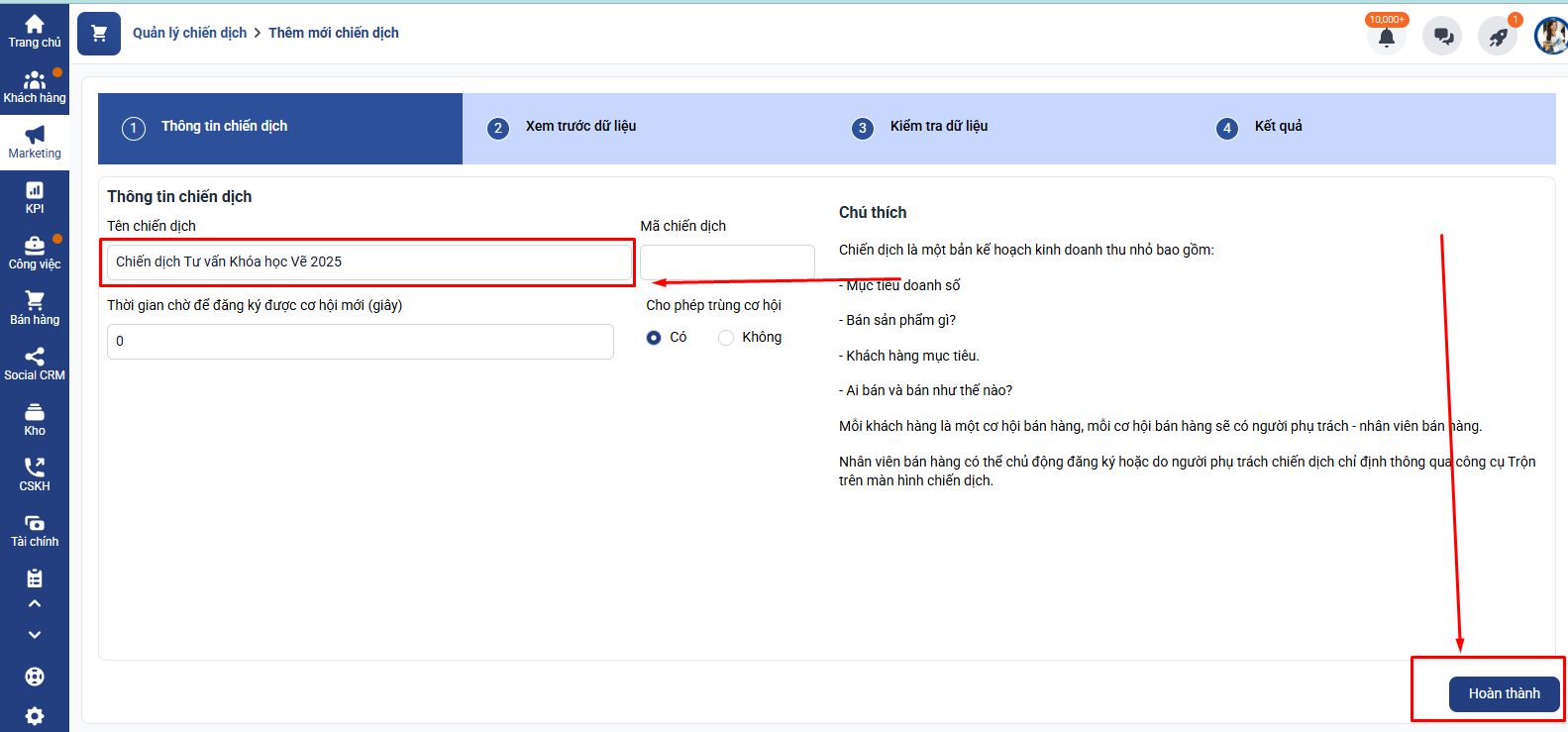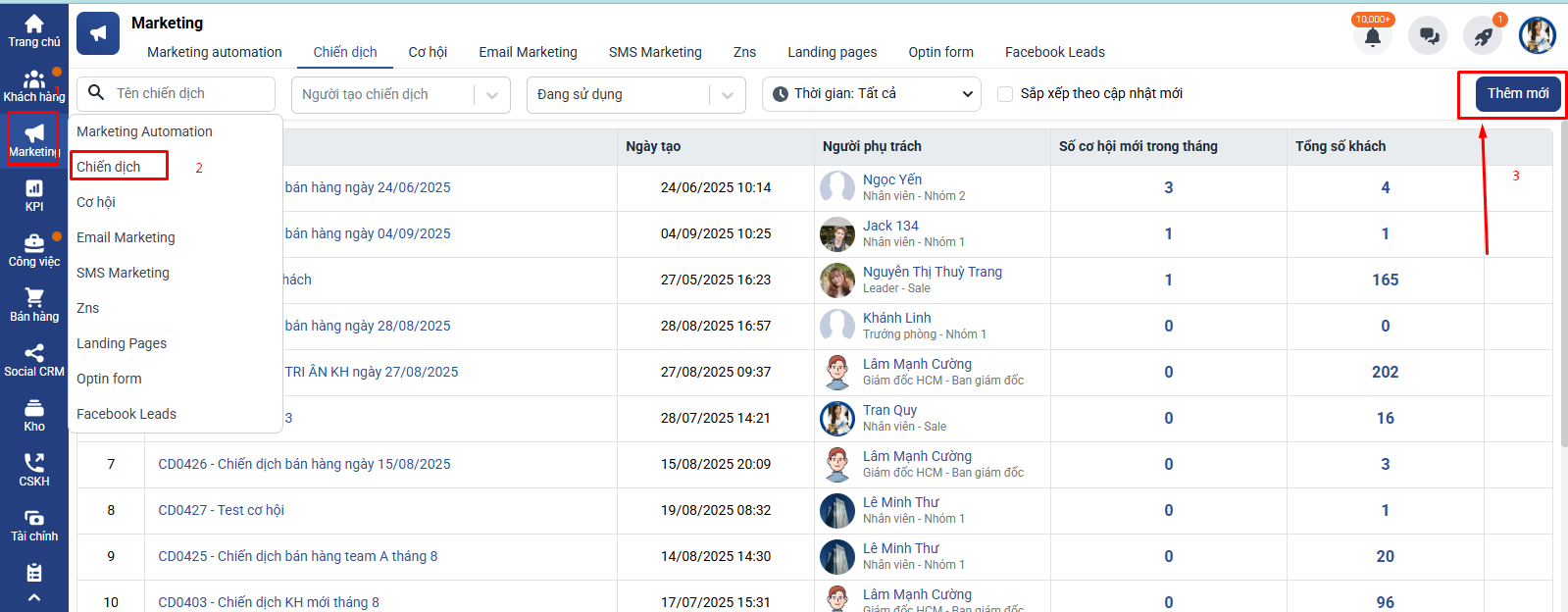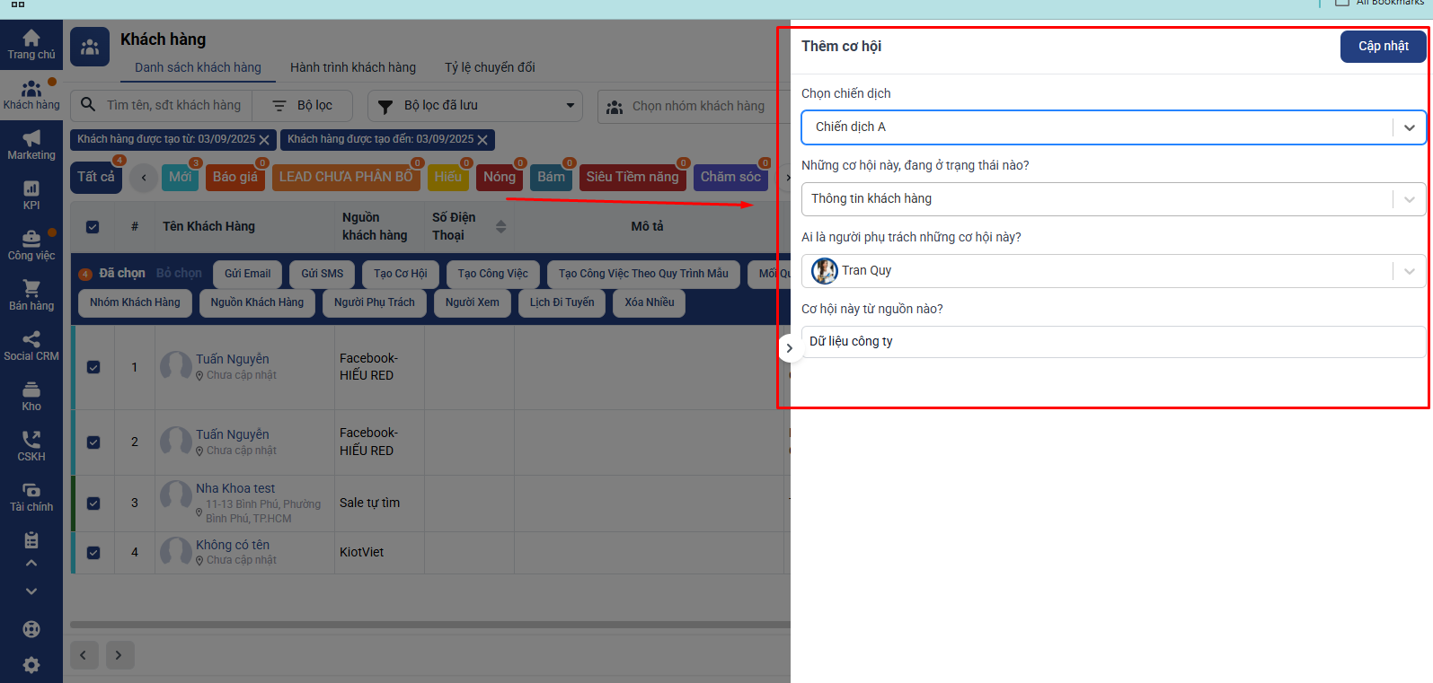 Chọn chọn tính năng Tạo cơ hội=> Thêm vào Chiến dịch A.