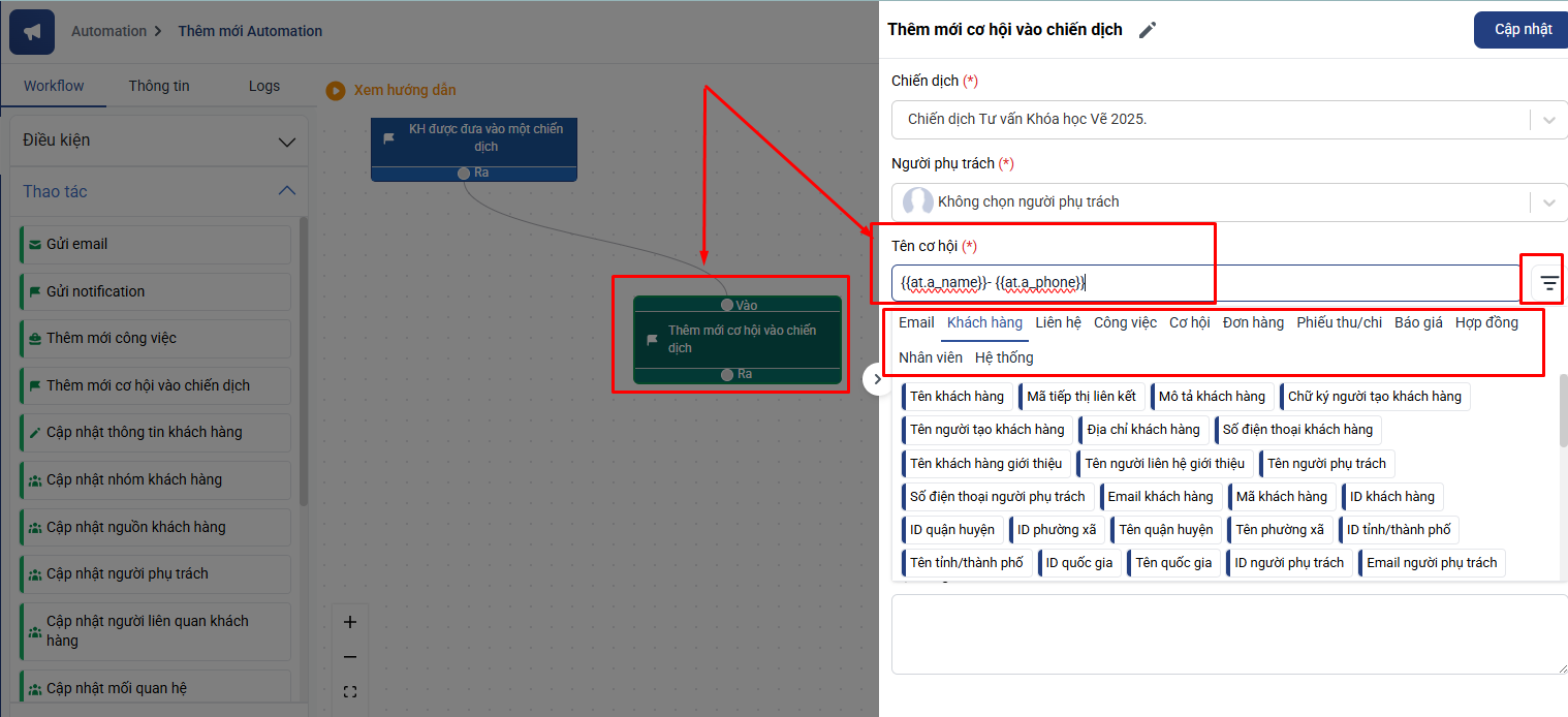 Tại bước cấu hình hệ quả, bạn có thể đặt tên cơ hội bằng cách chèn biến thông tin khách hàng (ví dụ: {{Họ tên}} - {{Nguồn khách hàng}} - {{Ngày}}).