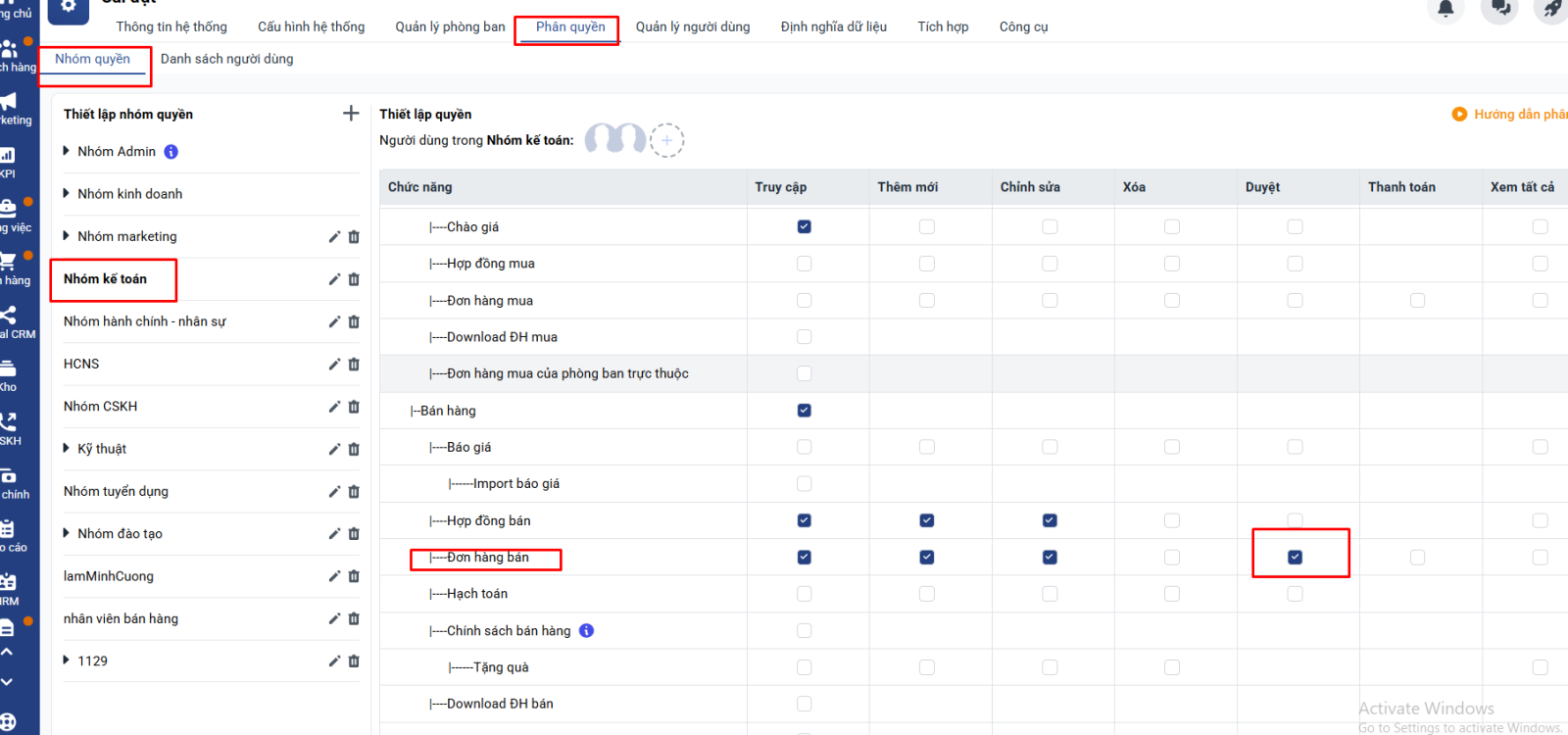 - Để phân quyền thanh toán đơn hàng cần báo admin vào mục cài đặt => phân quyền => chọn nhóm quyền => tích quyền thanh toán đơn hàng trên hệ thống: