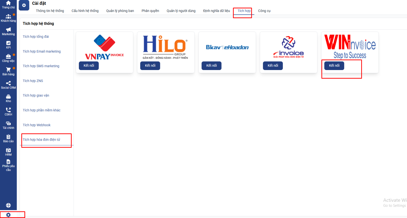 Bước 1: Bạn vào mục cài đặt => tích hợp => tích hợp hóa đơn điện tử => chọn Win Invoice
