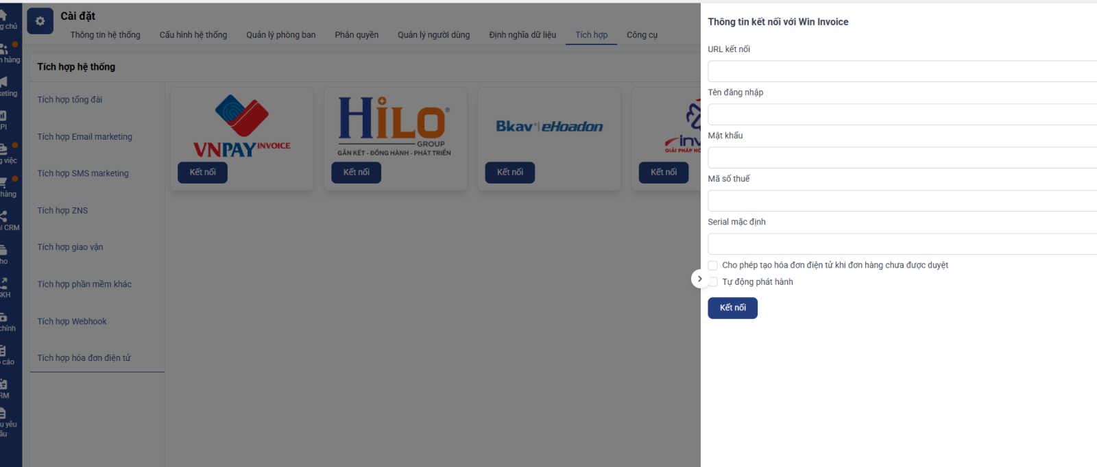 Bước 2: Điền các thông tin kết nối do bên Win Invoice cung cấp