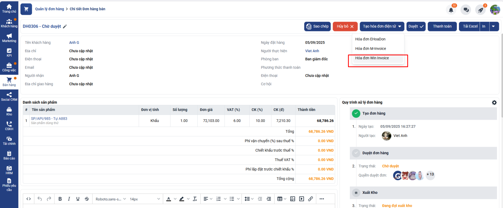 Các bạn vào chi tiết đơn hàng bán => ấn nút tạo hóa đơn điện tử và chọn hóa đơn Win Invoice