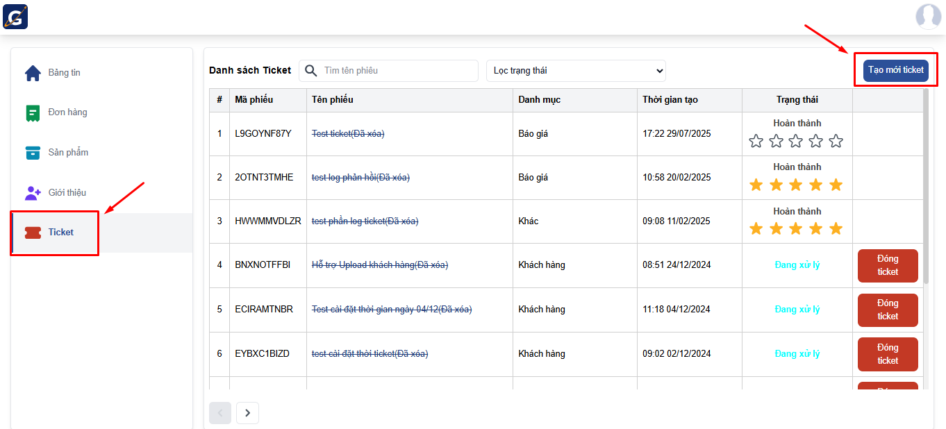 Sau khi đăng nhập, chọn Ticket → Tạo mới ticket.