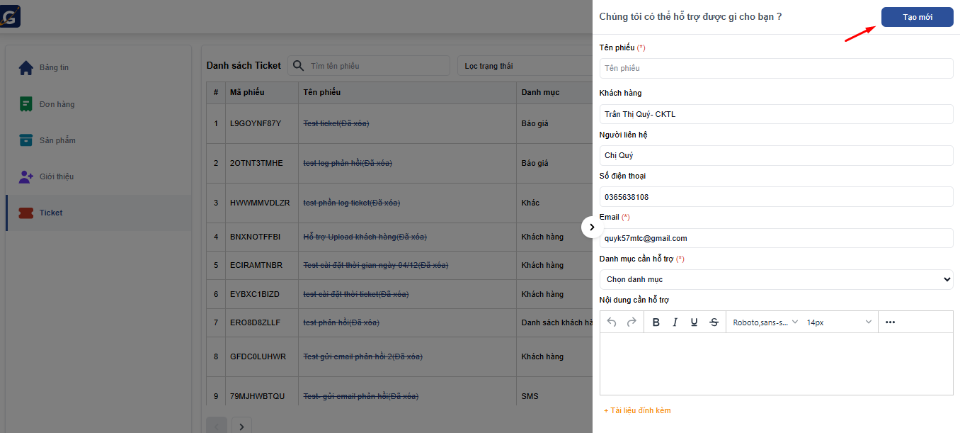 → Bấm Tạo mới. Ticket sẽ ngay lập tức được gửi đến bộ phận CSKH & Kỹ thuật của Getfly.