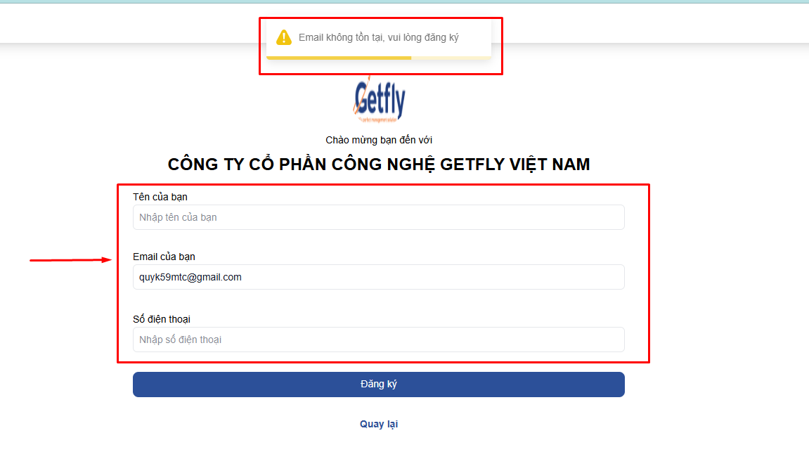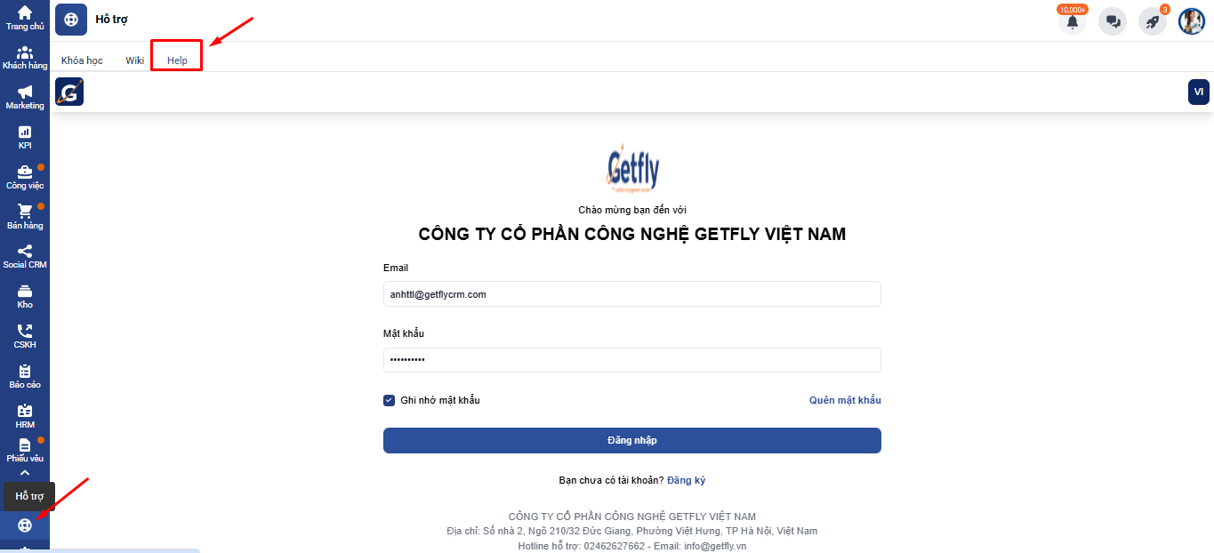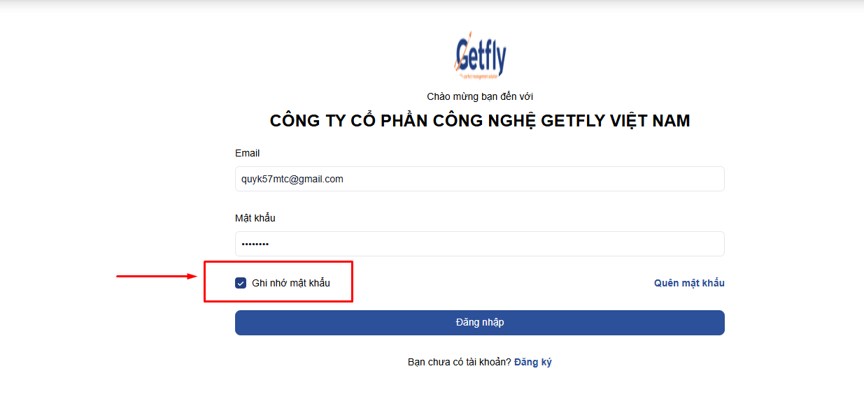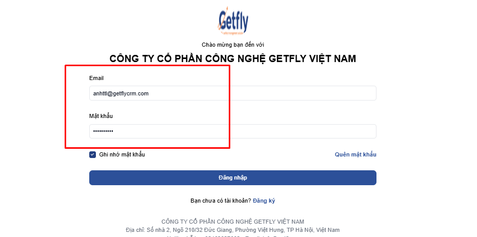Nhập email và mật khẩu bạn đang sử dụng trong hệ thống Getfly.