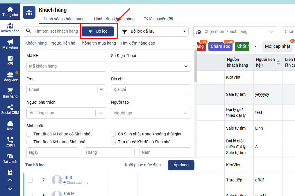 - Click vào Áp Dụng => Hệ thống sẽ lọc và hiển thị danh sách khách hàng thỏa mãn cả hai điều kiện (vừa thuộc bộ lọc khách hàng nguồn A, vừa ở nguồn B).