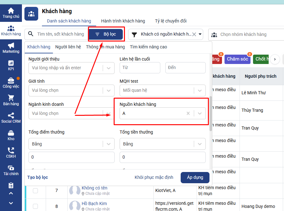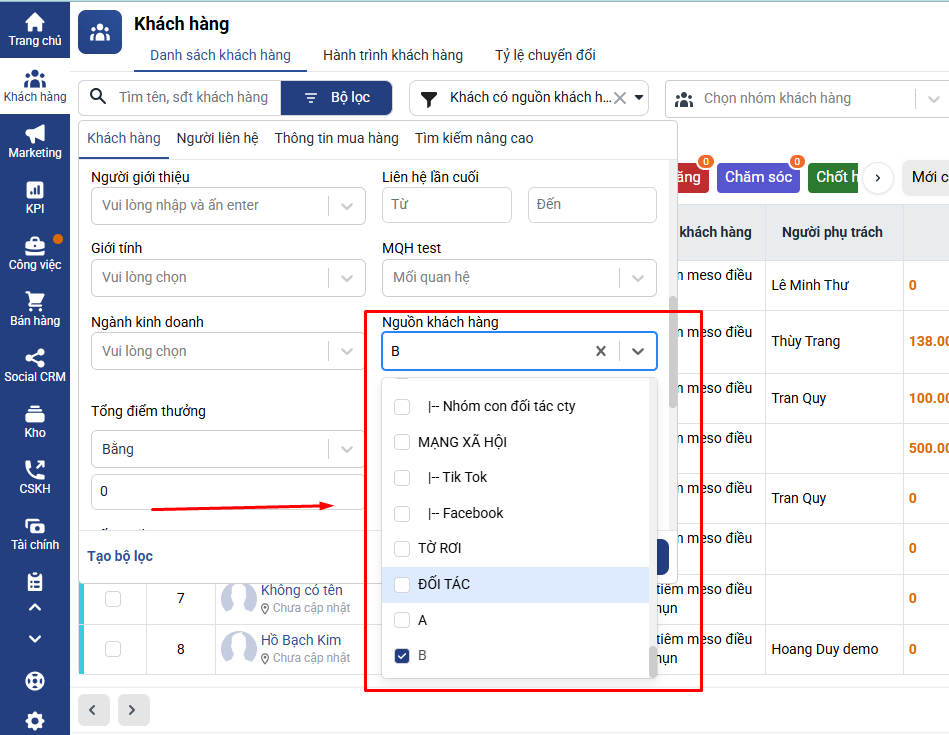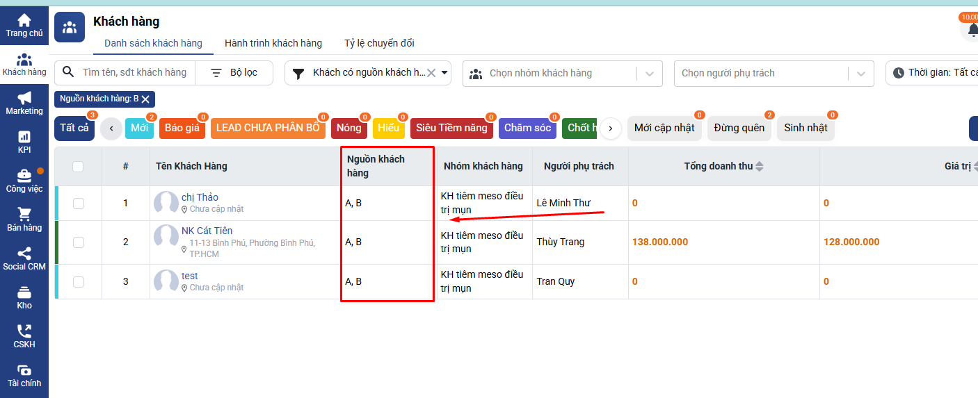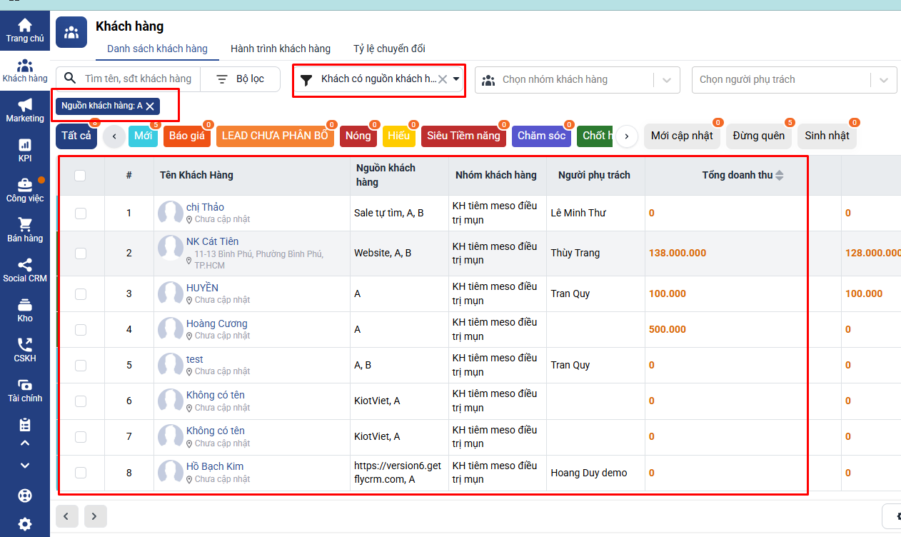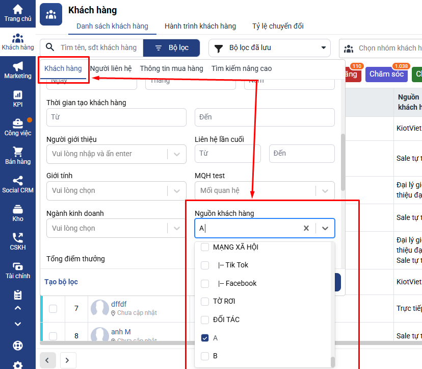 Lúc này danh sách khách hàng thuộc nguồn A sẽ được hiển thị.