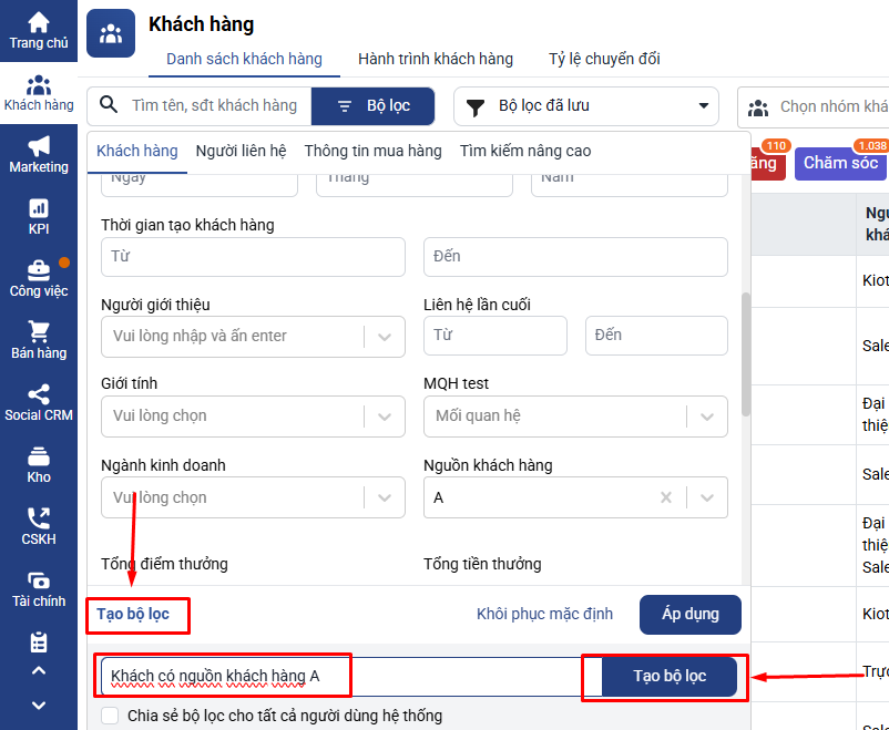 Đặt tên cho bộ lọc (ví dụ: Khách nguồn A) và nhấn Tạo bộ lọc để lưu lại.
