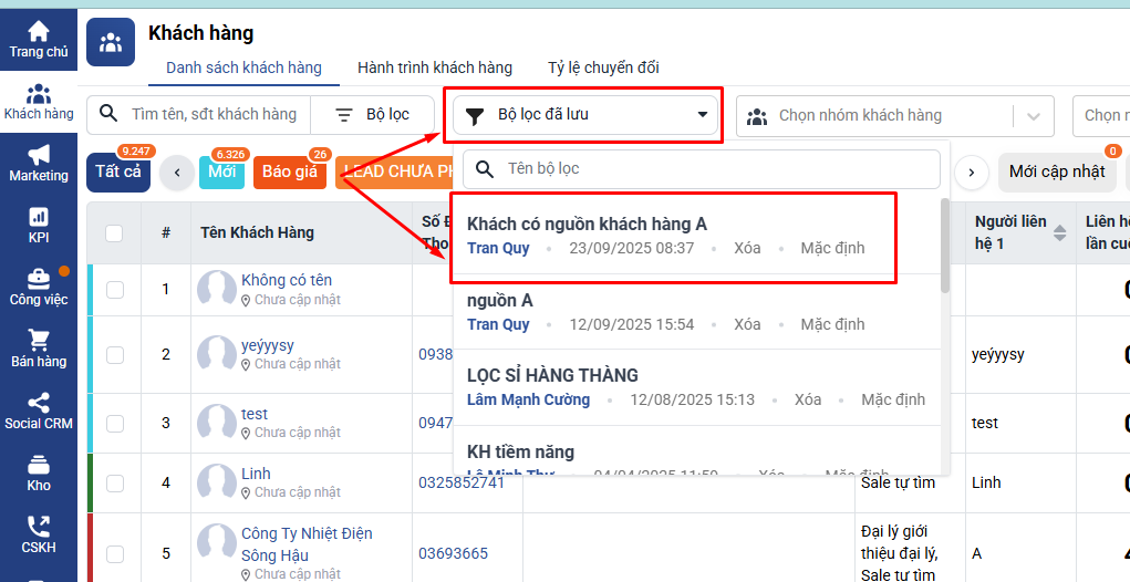 Danh sách khách hàng được hiển thị chính là những khách hàng vừa thuộc nguồn A, vừa thuộc nguồn B. Bạn có thể tiếp tục lưu bộ lọc này để tiện sử dụng cho các lần tìm kiếm sau.