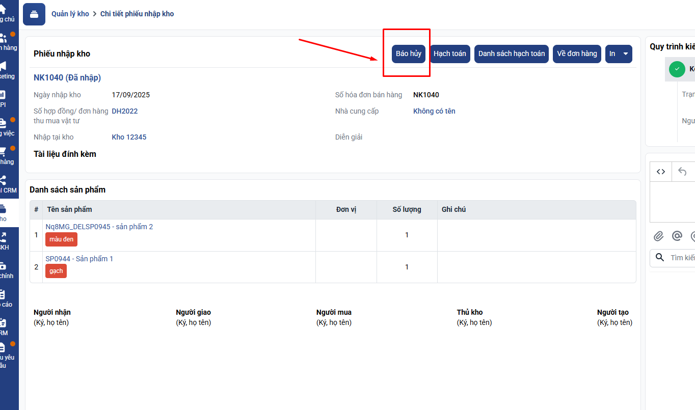 - Bạn có thể hủy phiếu nhập kho này đi sau đó nhập lại phiếu nhập kho khác để đúng thông tin