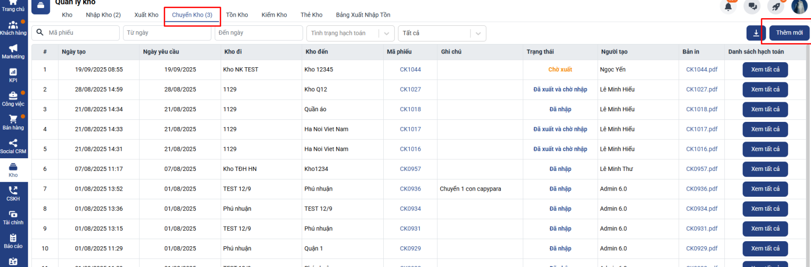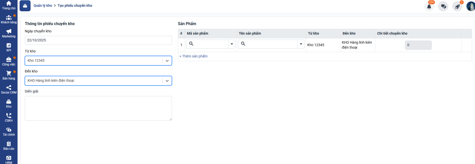 - Thao tác tại mục “Chuyển kho” trên hệ thống để thực hiện việc điều chỉnh này.