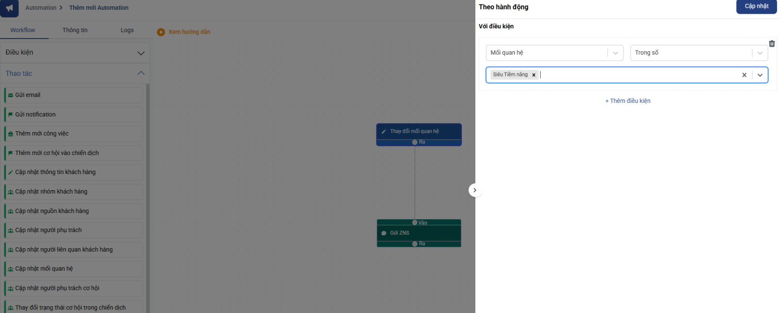 + Hành động thay đổi mối quan hệ: Chọn điều kiện Trong số và Giá trị: Siêu tiềm năng. Sau đó Nhấn Cập nhật để lưu điều kiện.