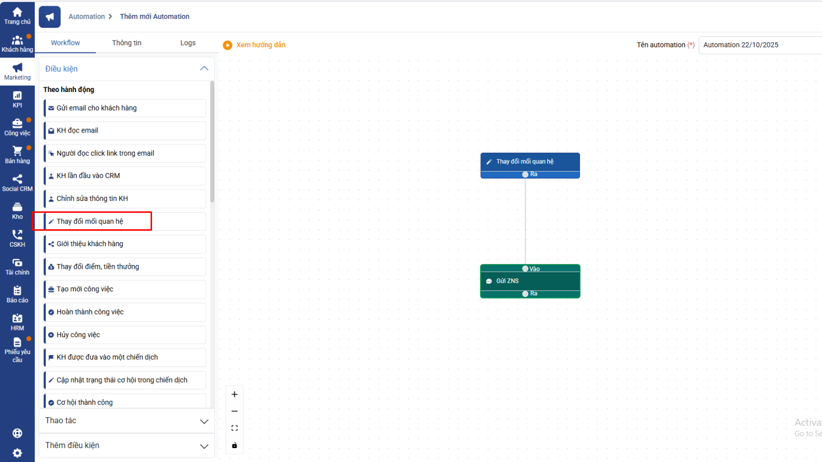- Trong giao diện workflow, kéo thả và chọn điều kiện Thay đổi mối quan hệ và thao tác gửi ZNS