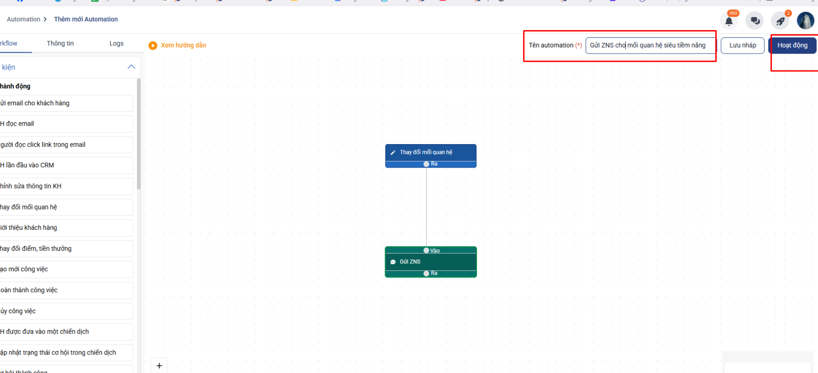 - Automation này giúp tự động gửi tin nhắn ZNS khi mối quan hệ khách hàng được thay đổi sang “Siêu tiềm năng”, nhằm đảm bảo khách hàng tiềm năng được chăm sóc kịp thời, nâng cao trải nghiệm và tỷ lệ chuyển đổi.