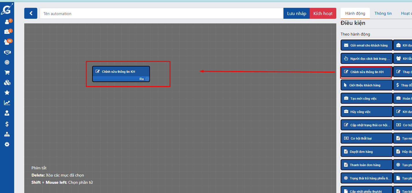 Ở phần bên phải màn hình, kéo khối “Chỉnh sửa thông tin khách hàng” vào khu vực thiết lập (phần trung tâm màn hình).
