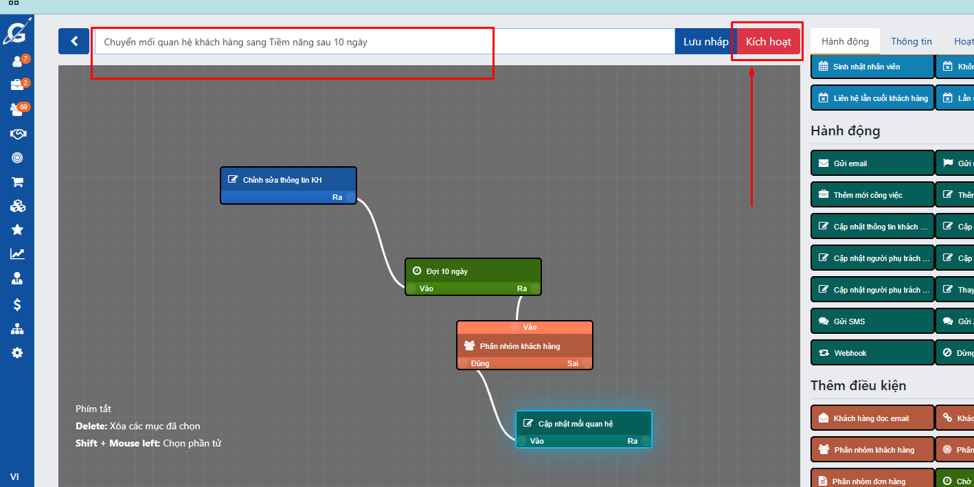 Ví dụ, bạn có thể tự động thay đổi mối quan hệ của khách hàng từ “Tiếp cận” sang “Tiềm năng” sau 10 ngày, giúp việc quản lý tệp khách hàng luôn cập nhật và thống nhất.