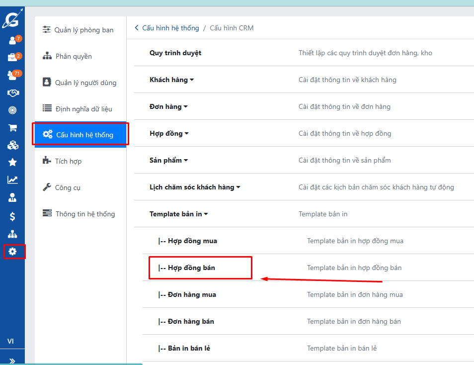 Vào menu Cài đặt → Cấu hình CRM → Template bản in