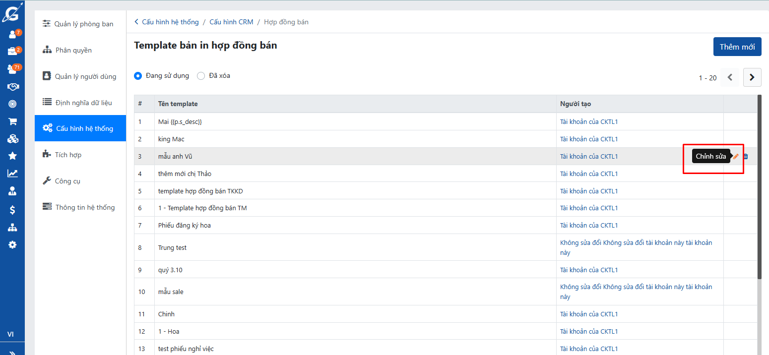 Tại danh sách template, chọn Hợp đồng bán hàng → chọn bản in bạn muốn điều chỉnh → nhấn Sửa.