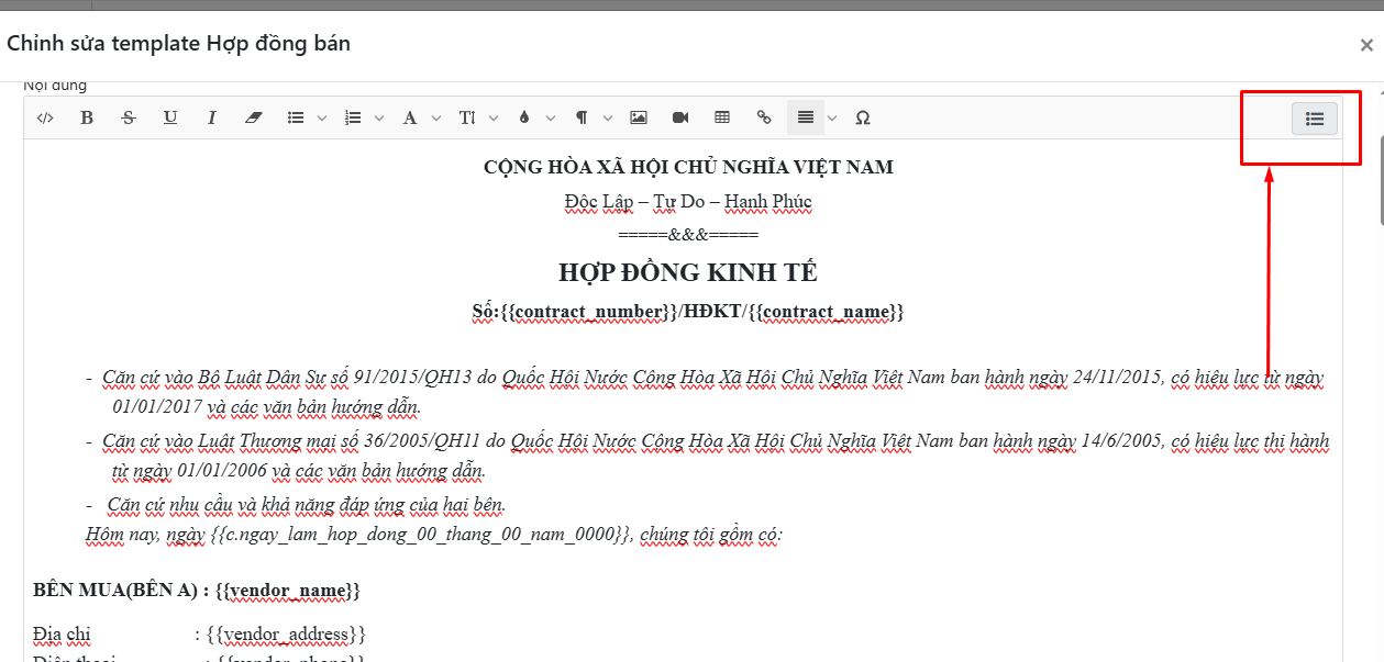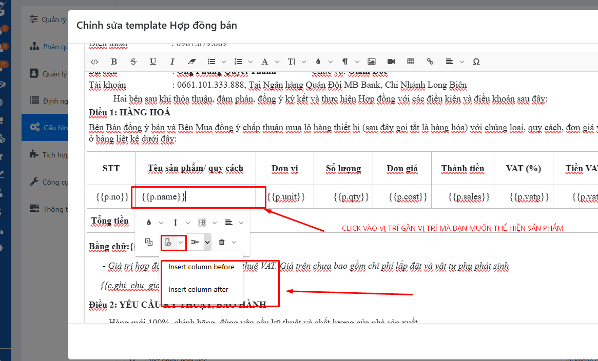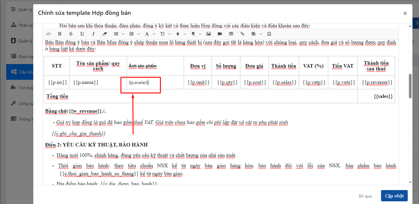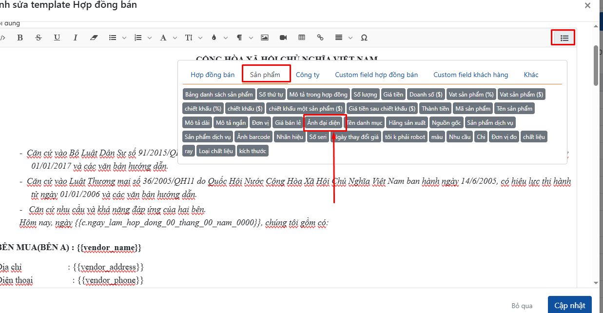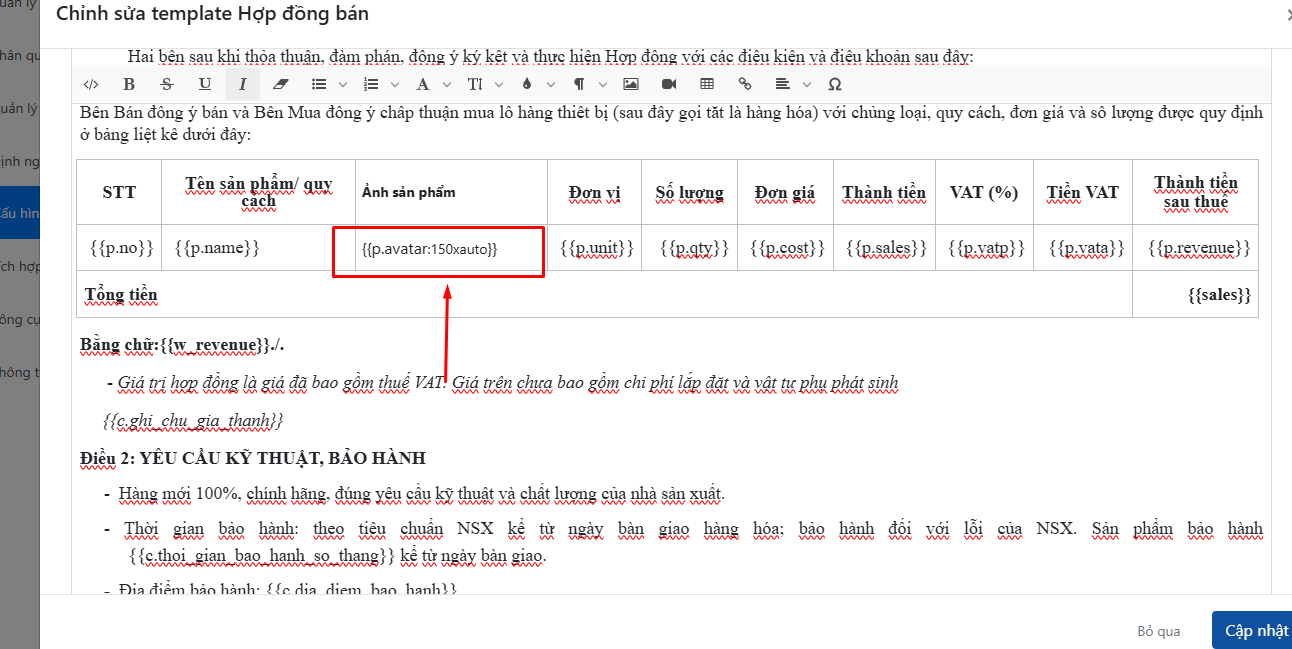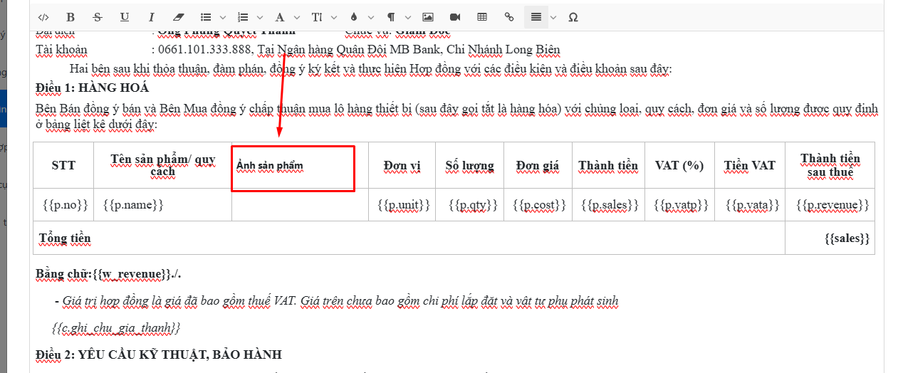 Bài viết này sẽ hướng dẫn bạn chi tiết cách chèn biến ảnh sản phẩm và điều chỉnh kích thước hiển thị ảnh trong hợp đồng.