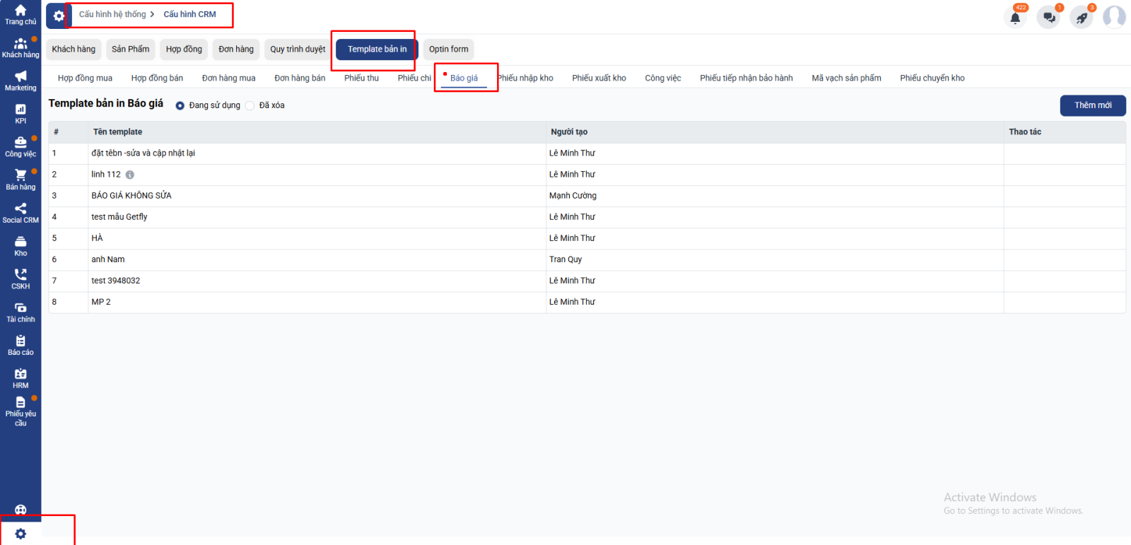 Vào menu Cài đặt → Cấu hình CRM → Template bản in