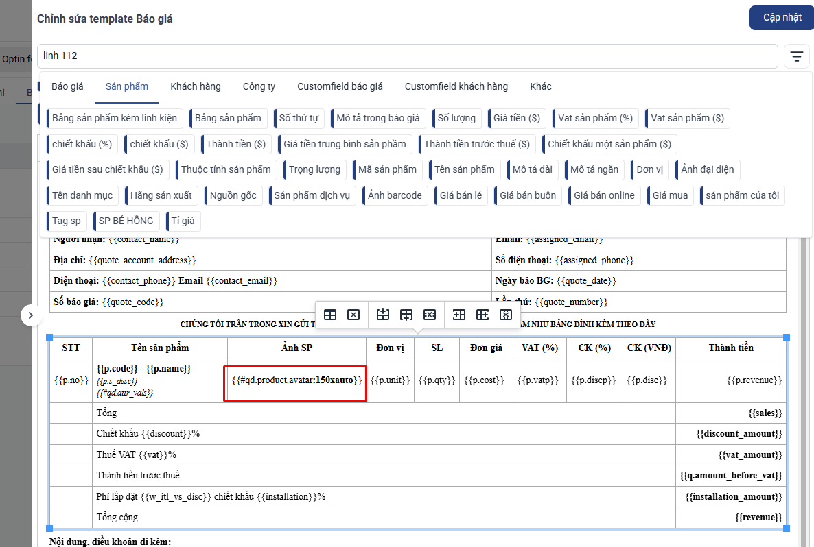 Sau khi chèn biến ảnh sản phẩm, bạn có thể tùy chỉnh kích thước ảnh hiển thị để phù hợp với bố cục báo giá.