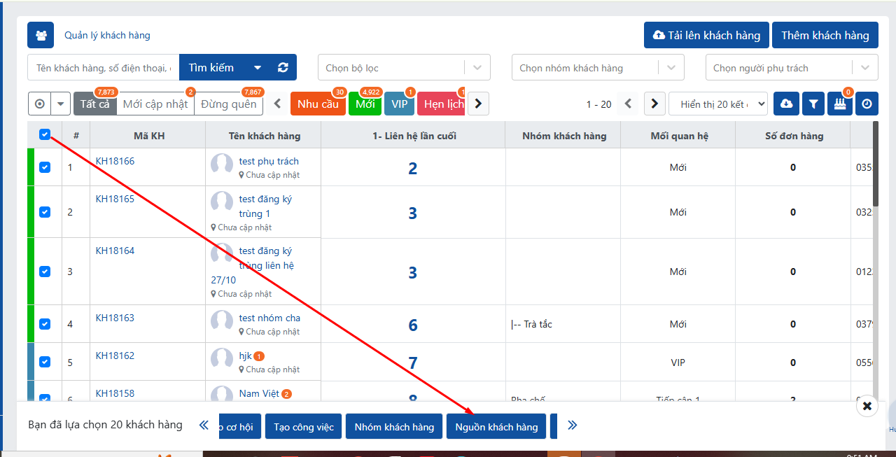 Tích chọn số lượng lớn khách hàng → chọn Nguồn khách hàng
