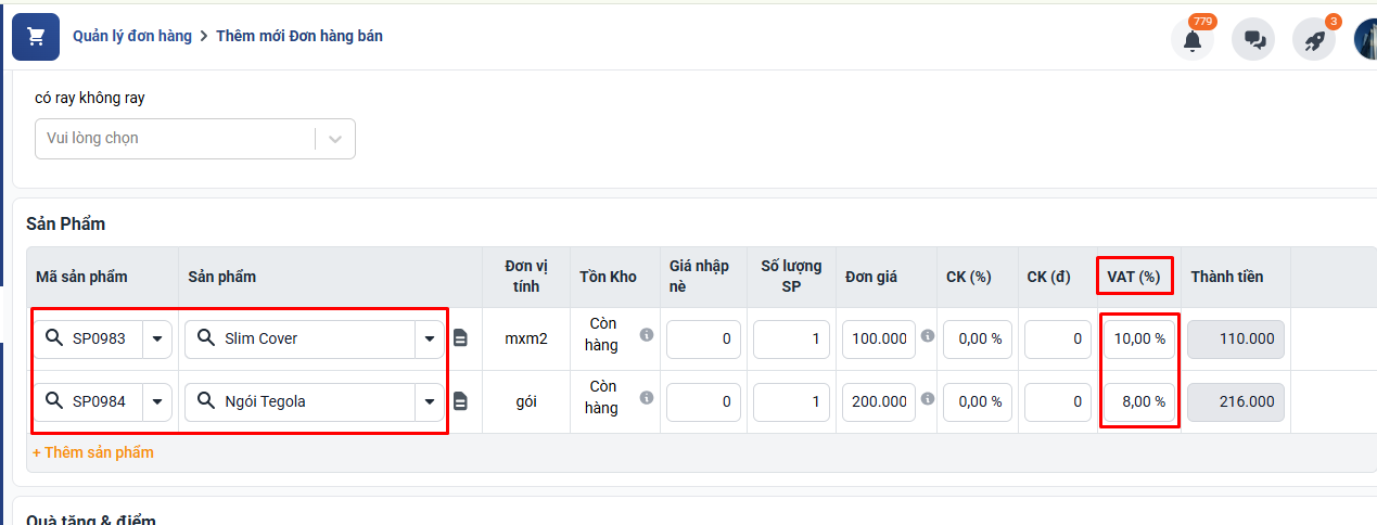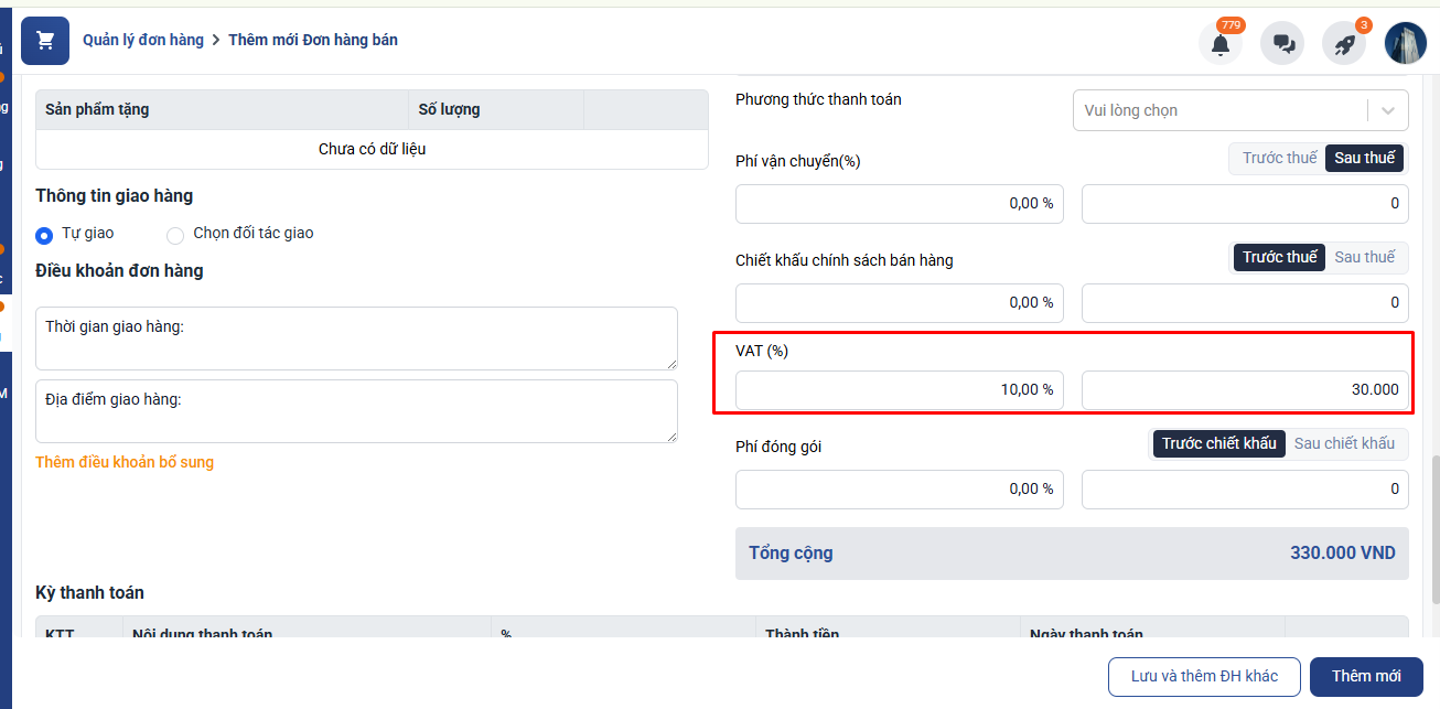 - Bạn chọn mức VAT trong phần chi tiết đơn hàng, hệ thống sẽ tự động áp dụng cho tổng giá trị đơn.