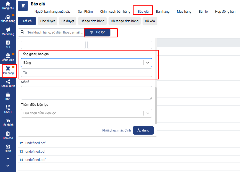 Nhấn vào biểu tượng Bộ lọc → Tổng Giá trị báo giá.