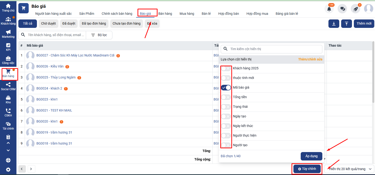Làm thế nào để tùy chỉnh cột hiển thị ở màn hình quản lý báo giá?