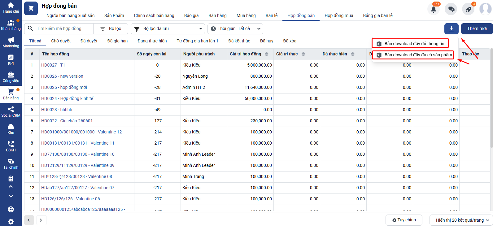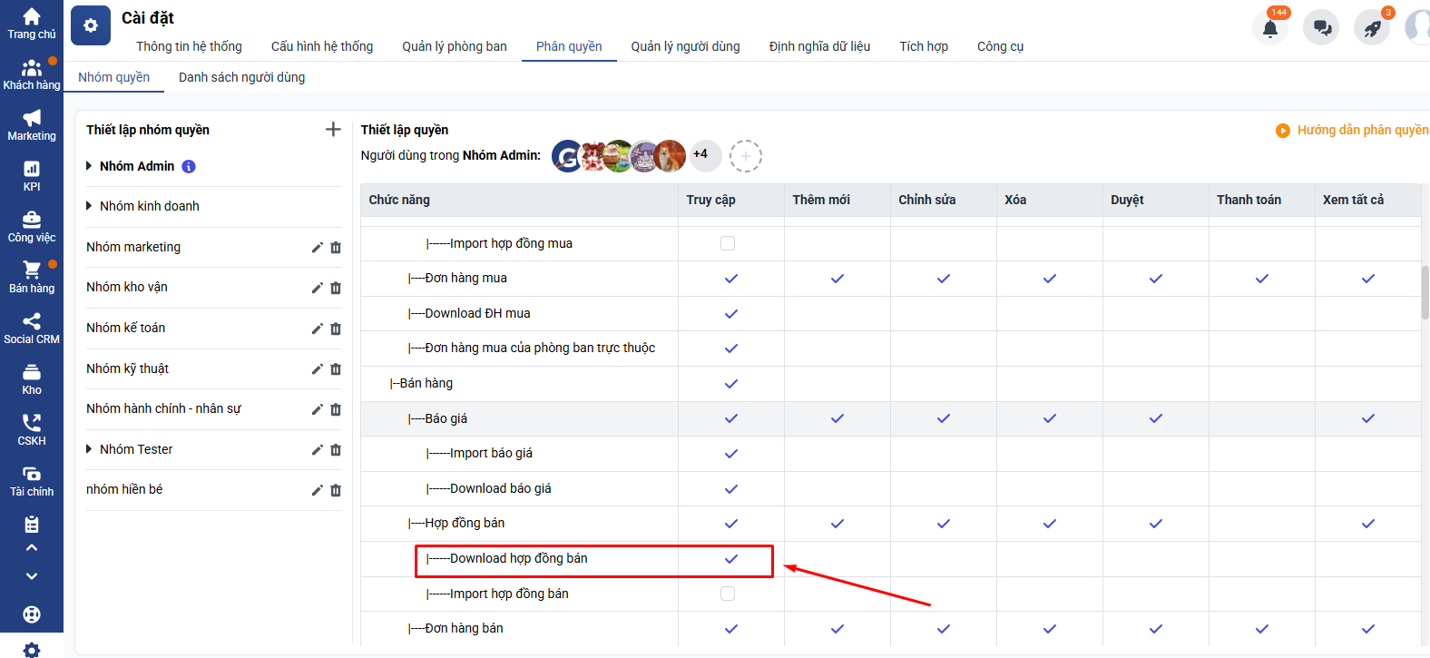 Trường hợp bạn muốn Tải danh sách hợp đồng hàng loạt: cần được cấp quyền “Download hợp đồng” trong phần Phân quyền hệ thống. Nếu bạn không thấy nút tải xuống hoặc không thực hiện được thao tác, vui lòng liên hệ quản trị viên để được cấp quyền phù hợp.