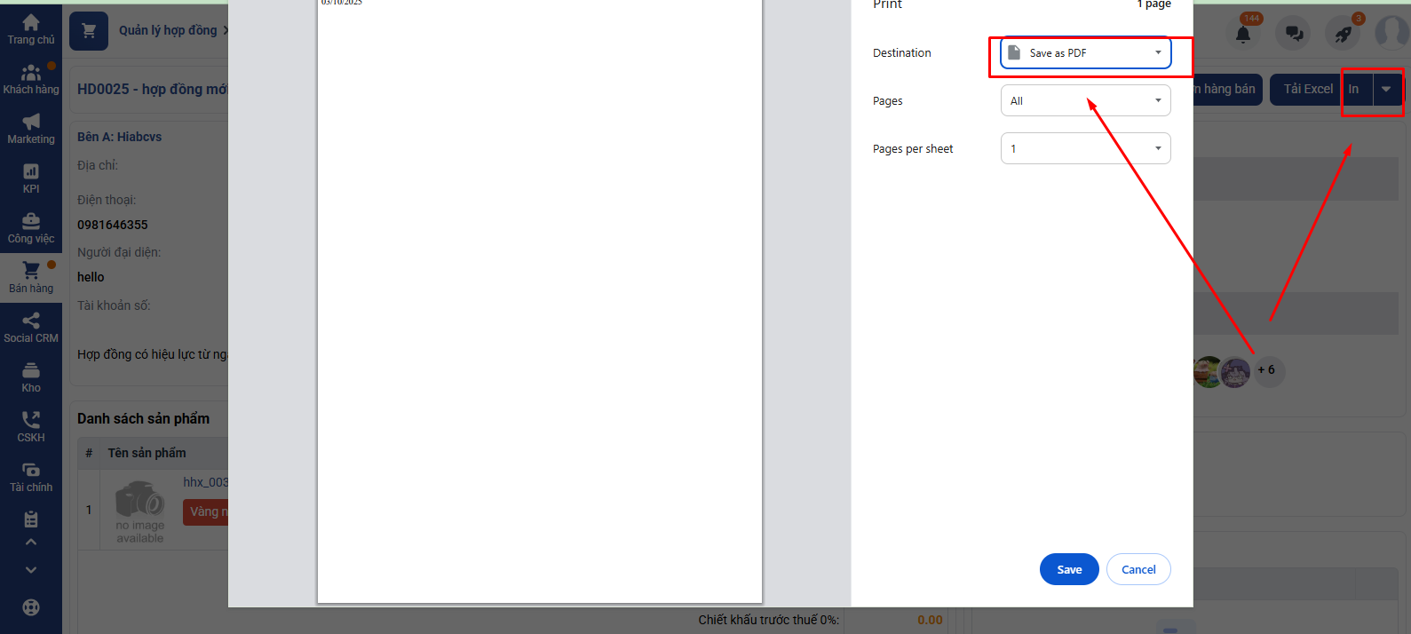 Trong giao diện chi tiết hợp đồng, chọn nút Tam giác cạnh nút In / Nút in → Chọn mẫu in muốn tải xuống → Tải xuống PDF