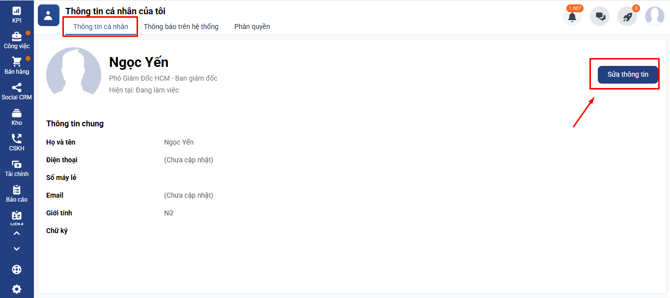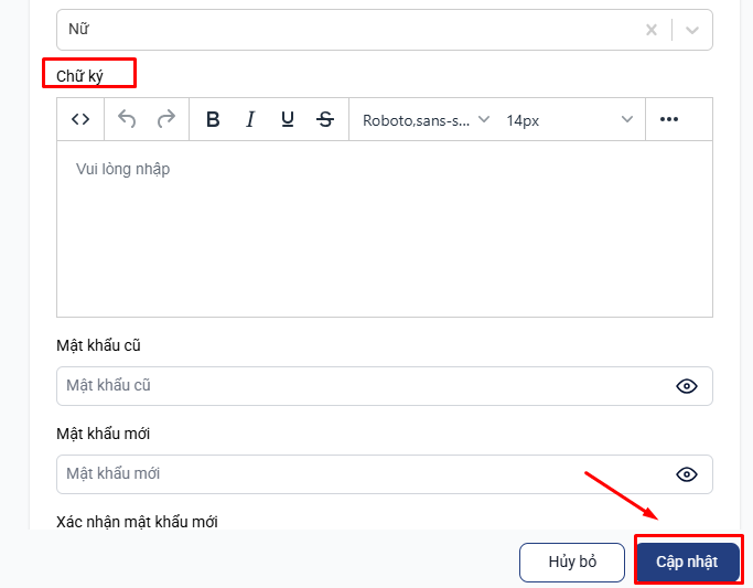 Bạn truy cập Tài khoản cá nhân (ảnh đại diện góc phải trên cùng) → Thông tin cá nhân → bấm Sửa thông tin → điền chữ ký và bấm Cập nhật