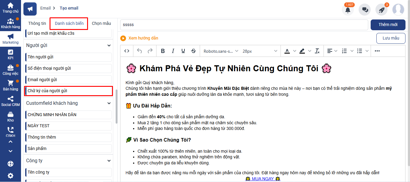 Trong bảng biến khi gửi email, bạn chèn biến chữ ký tương ứng vào nội dung email hoặc template để chữ ký hiển thị đúng khi gửi.