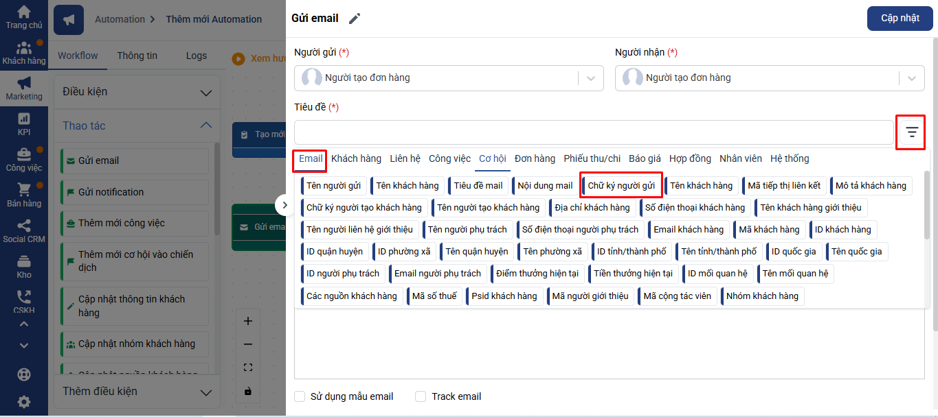 Khi gửi email trực tiếp từ hệ thống hoặc thông qua Automation, người dùng cần thiết lập và chèn chữ ký email để hiển thị đúng trong nội dung gửi đi.