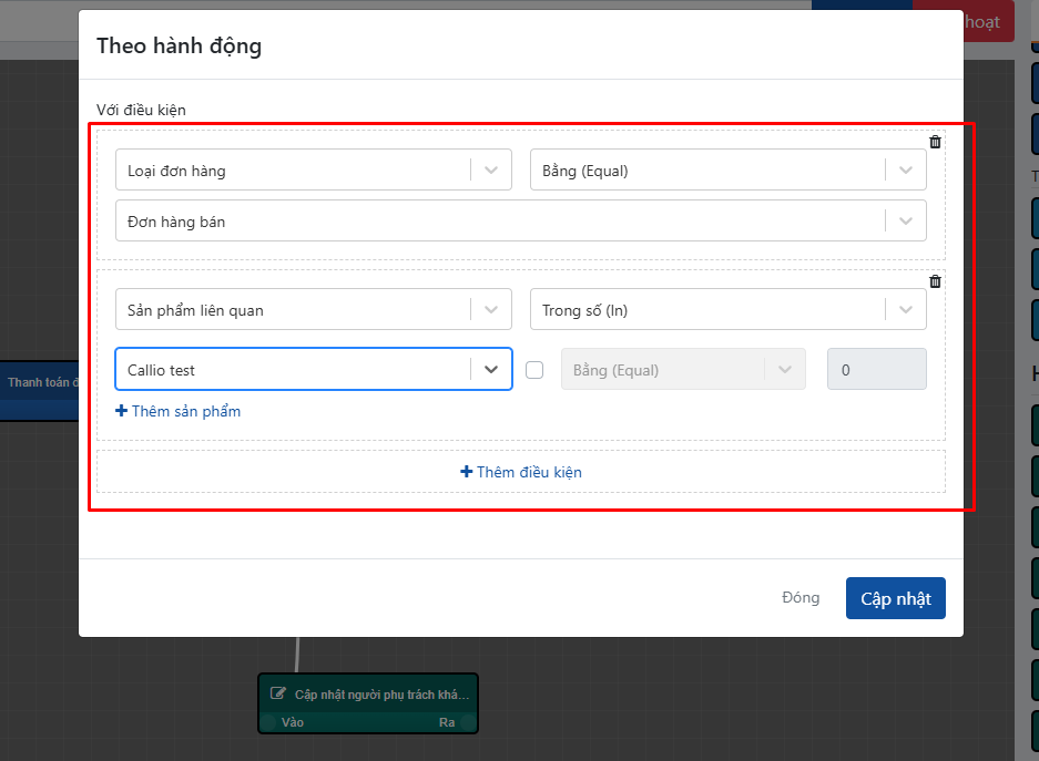 - Với hàng động thanh toán đơn hàng: Chọn điều kiện loại đơn hàng là đơn hàng bán và chọn sản phẩm chứa loại sản phẩm bạn đang muốn chạy trong auto => ấn cập nhật