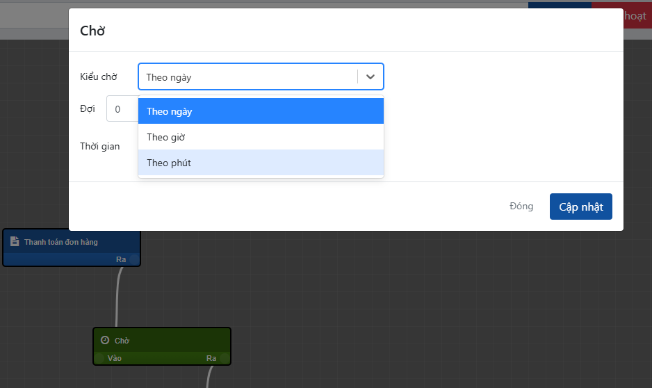 - Với khối chờ: bạn có thể cài đặt thời gian mong muốn theo ngày theo giờ theo phút => ấn cập nhật