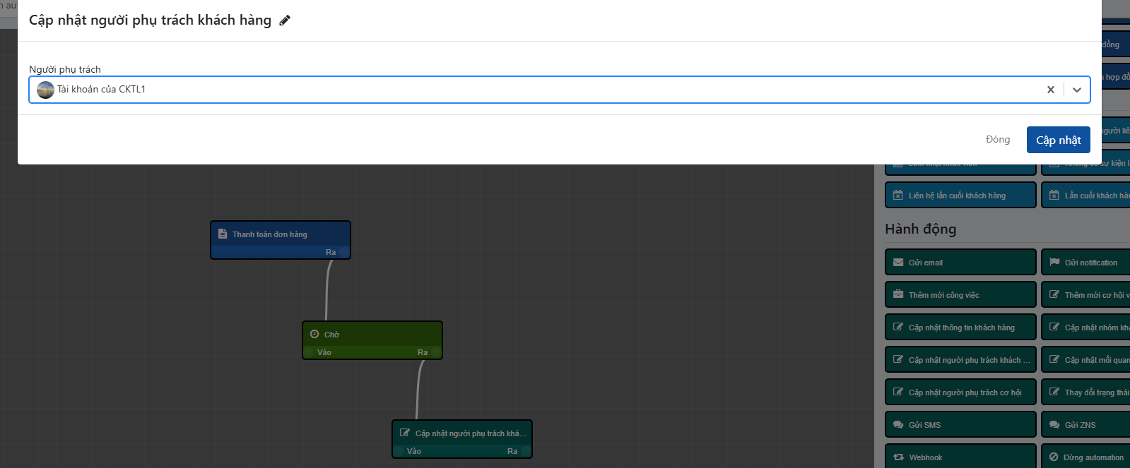 - Với hệ quả cập nhật người phụ trách khách hàng: bạn chọn người phụ trách khách hàng bạn muốn cập nhật sau khoảng thời gian chờ
