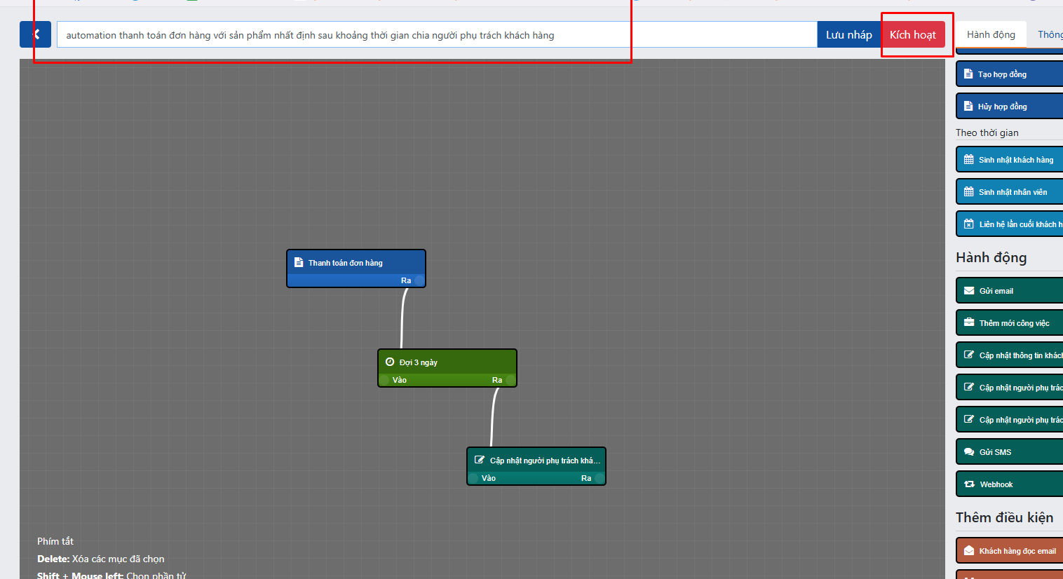 Để tạo automation thanh toán đơn hàng với sản phẩm nhất định sau khoảng thời gian chia người phụ trách khách hàng các bạn thao tác như sau: