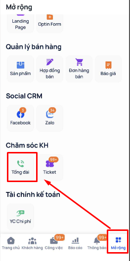 Bước 1: Các bạn mở ứng dụng Getfly CRM, sau đó vào Mục Mở rộng → Tổng đài