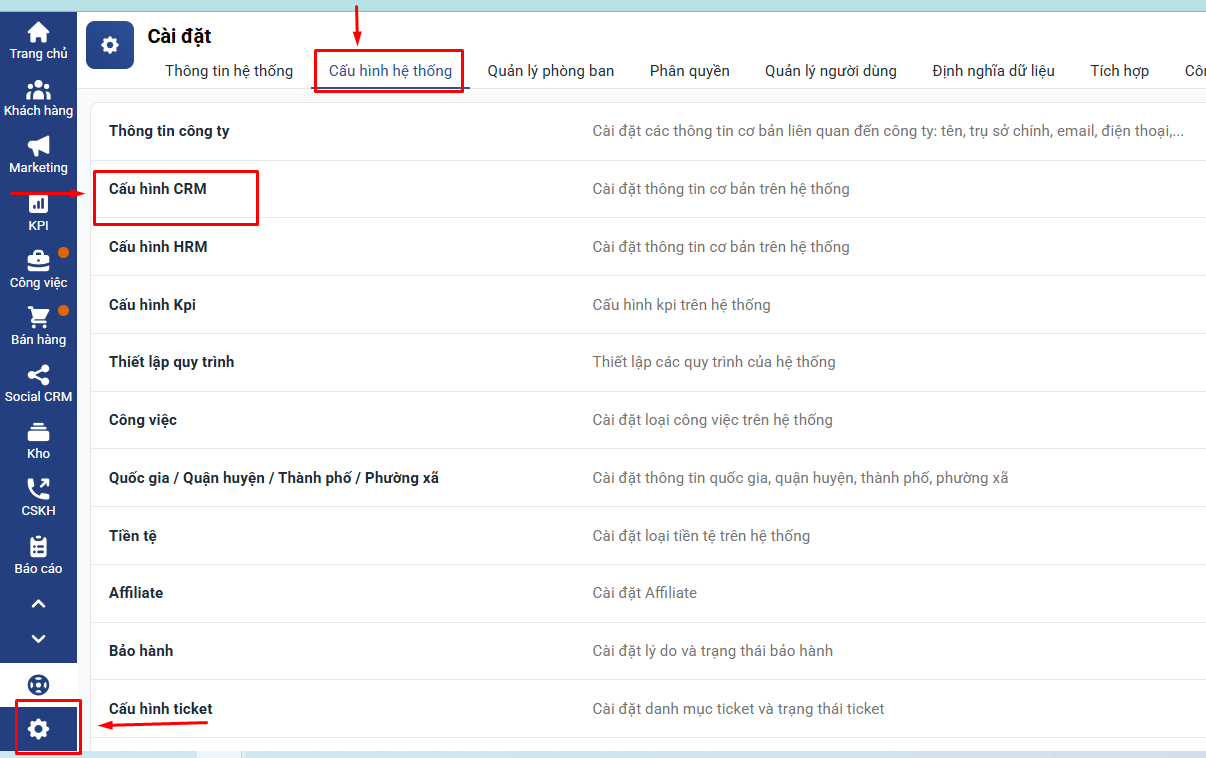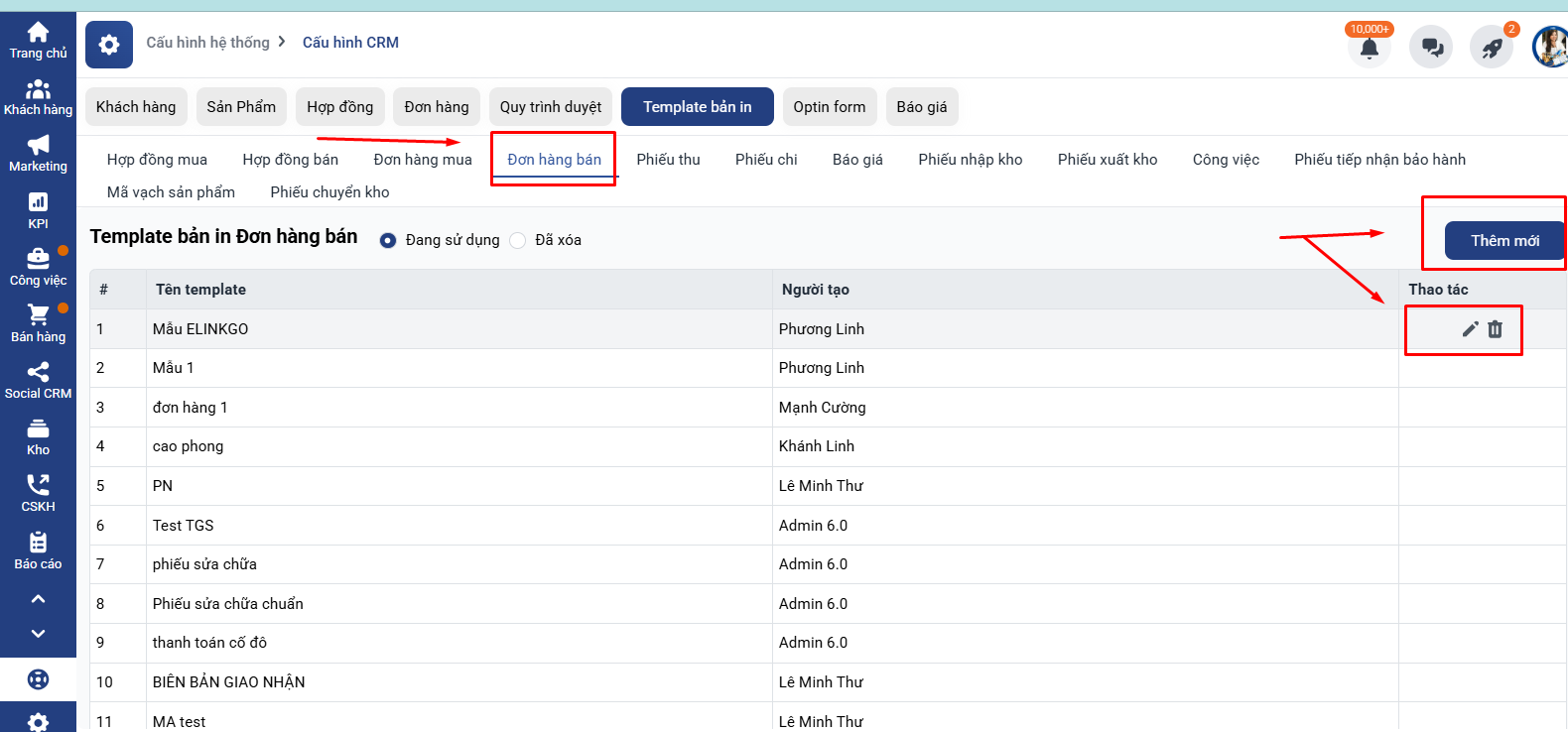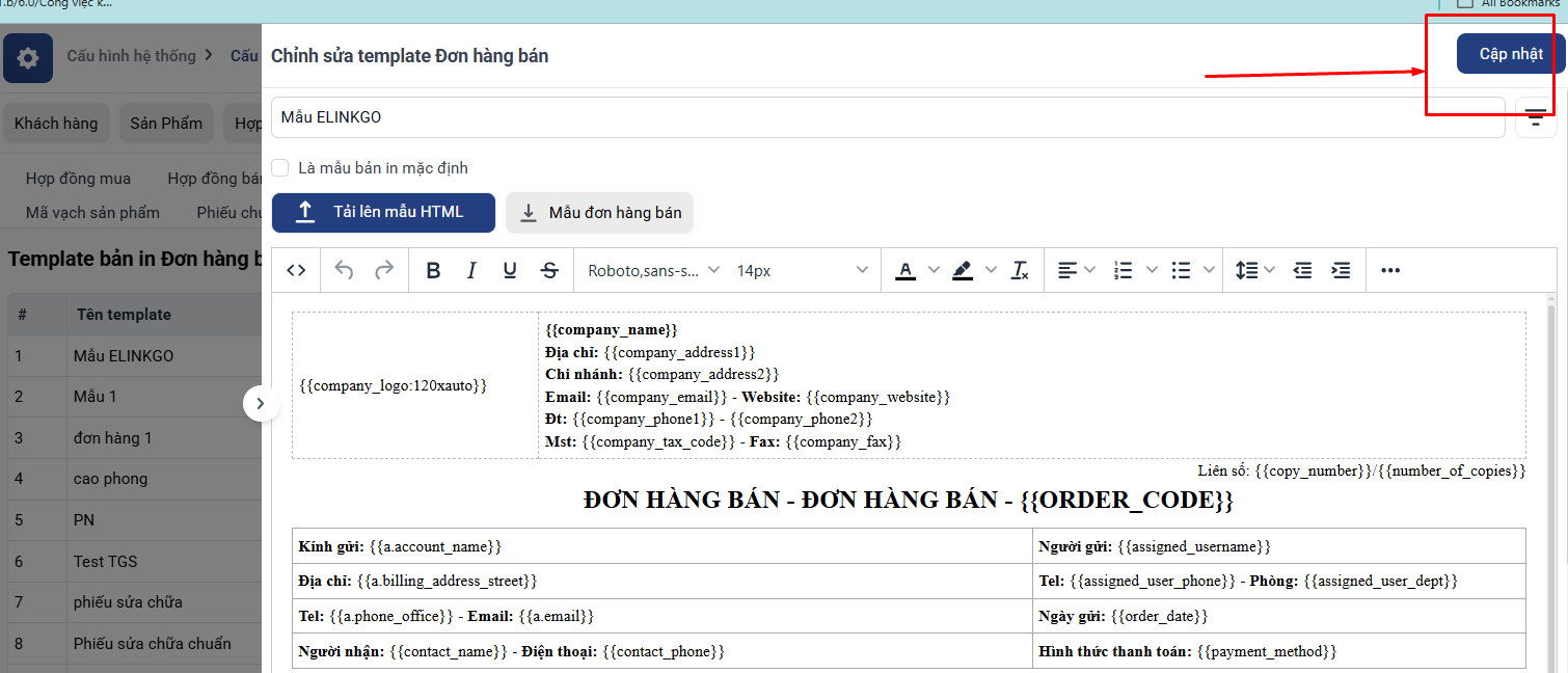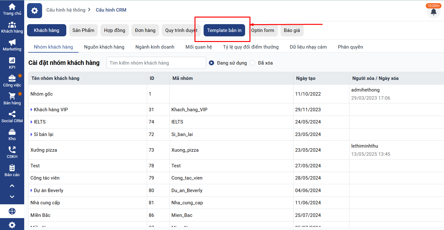 Vào Cài đặt → Cấu hình CRM → Template bản in.