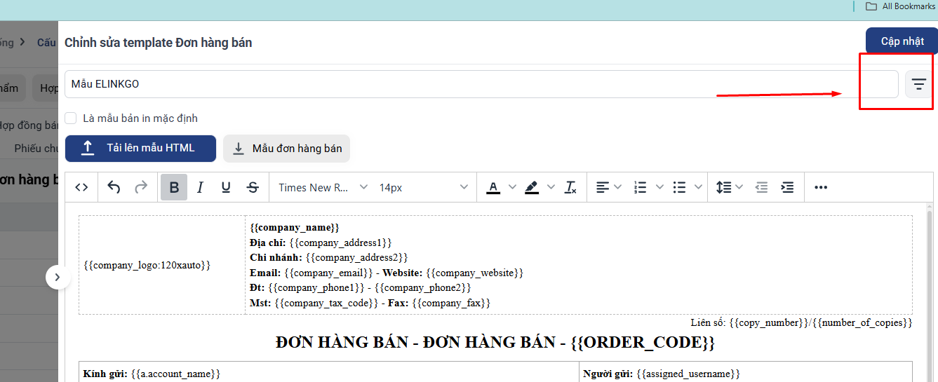 Sau khi hoàn tất việc chèn biến, click Cập nhật để lưu thông tin.