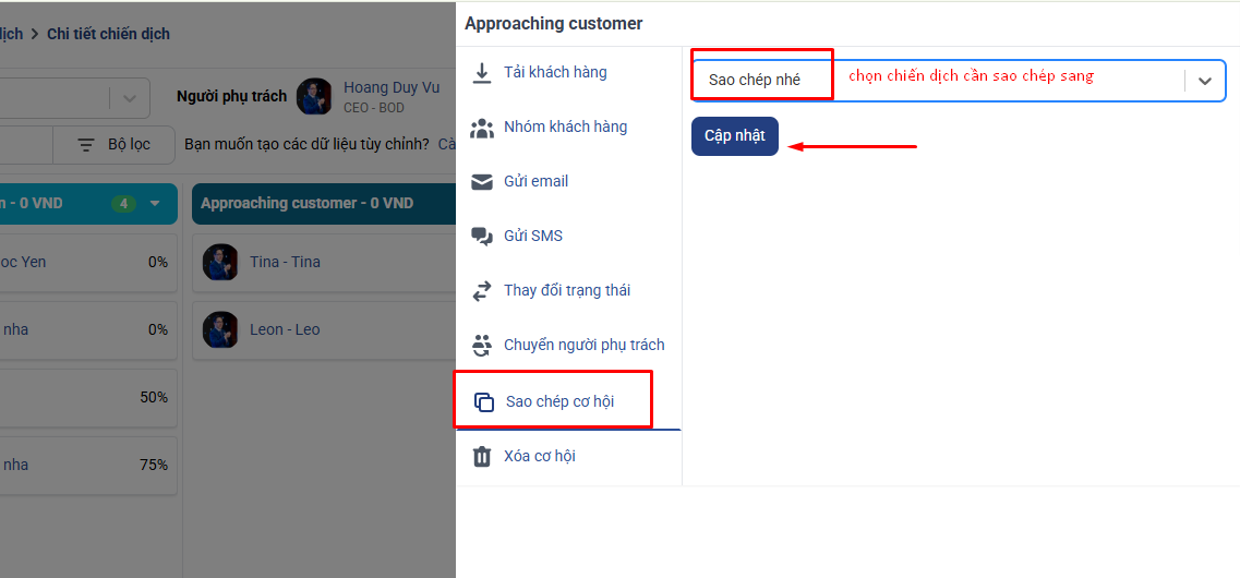 Thao tác: - Vào Marketing -> vào Chi tiết chiến dịch -> Tất cả -> Click vào nút tam giác ở góc của cột trạng thái -> Sao chép cơ hội -> Chọn chiến dịch mới cần đẩy vào -> Cập nhật