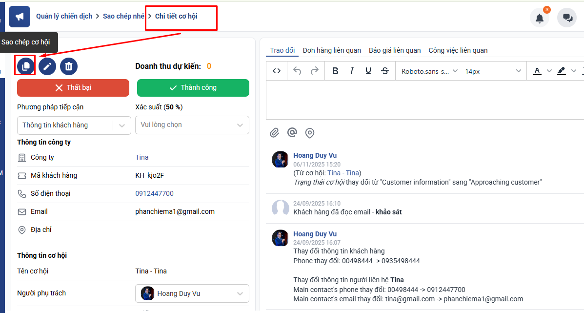 Thao tác: Vào Marketing -> vào Chi tiết chiến dịch -> Tất cả -> Sao chép cơ hội