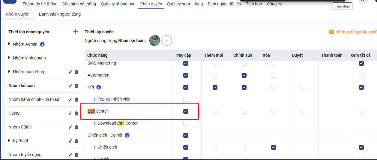 + Tài khoản kiểm tra phải có quyền truy cập callcenter