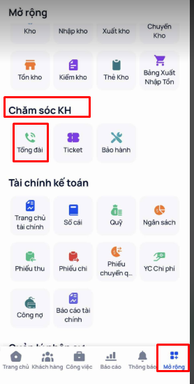 Bước 1: Bạn mở APP Getfly CRM → Vào mục Mở rộng → Chăm sóc khách hàng → Module Tổng đài