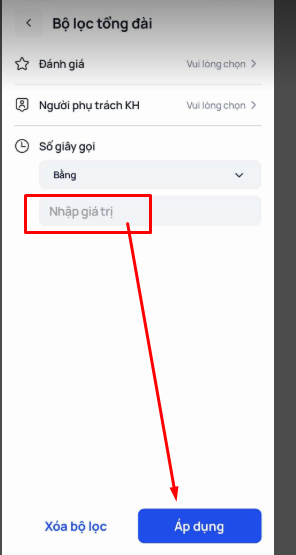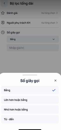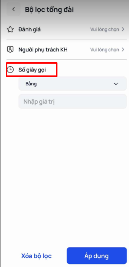 Để lọc các cuộc gọi có thời lượng trên X phút trên APP Getfly CRM ( ví dụ lọc các cuộc gọi có thời gian gọi lớn hơn 1 phút), bạn có thể thực hiện các bước sau:
